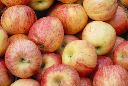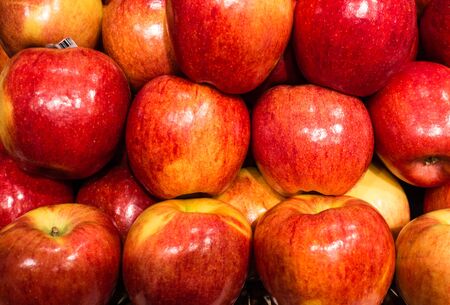 Close-up and background of red fresh apples lying on top of each other.