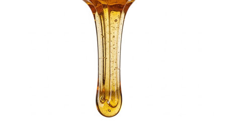 Thick golden honey drips in a viscous stream, filled with tiny air bubbles, against a clean white background.