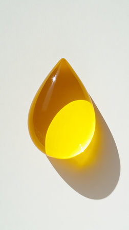 Yellow glass droplet casting shadow on white background