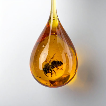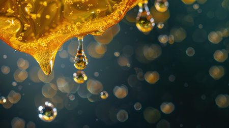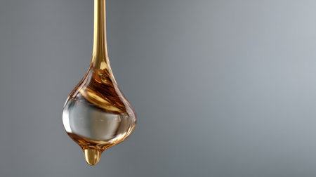 Stunning 4K image of a golden honey droplet, perfect for minimalist design and advertising campaigns. High clarity and fluidity.