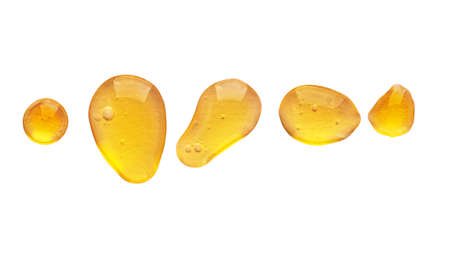 Golden yellow abstract oil bubbles or face serum drops isolated on white background. Oil bubbles macro photography.