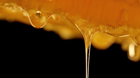 Honey dripping and falling from above, golden and sticky, mid-air capture, isolated on black