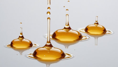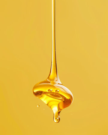 A stunning close-up image of a golden oil droplet suspended in air, showcasing its unique texture and soft lighting create a serene and calming effect.