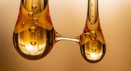 Honey-colored liquid droplets on beige surface with bubbles highlighting fluid texture
