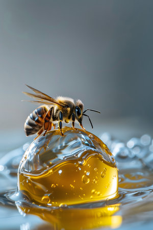 Captured in a studio setting, a bee gently alights upon a glistening droplet of golden liquid, possibly honey. The image conveys a sense of natures harmony and delicate balance.