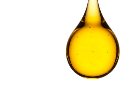 A yellow drop of oil on a white background. Space for text