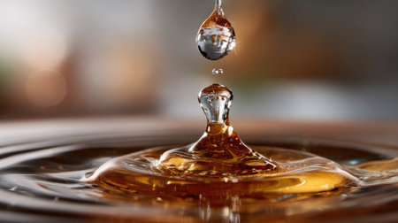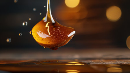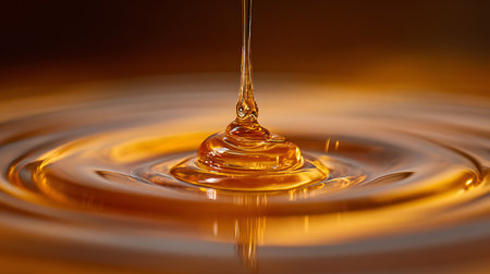 A mesmerizing close-up of a single golden honey drops gracefully falling into a glistening pool, creating subtle, captivating ripples.