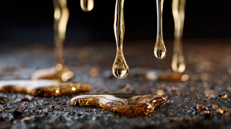 This mesmerizing close-up image showcases golden honey dripping in a slow, elegant manner onto a dark surface. The liquid forms unique patterns as it glistens in the light, emphasizing its sticky texture and inviting quality. Perfect for culinary themes and food photography.