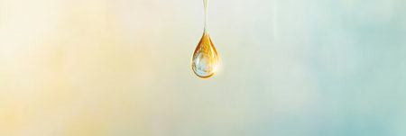 Golden translucent drop reflecting on a wet surface, creating gentle ripples in a calming minimalist composition against a soft pastel background, evoking serenity and purity