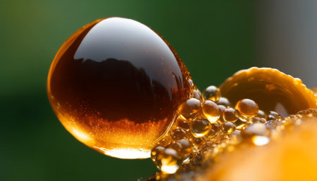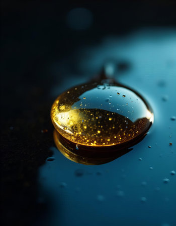 A stunning close-up of a golden oil droplet, showcasing its smooth surface and vivid reflections. Perfect for culinary and beauty themes.