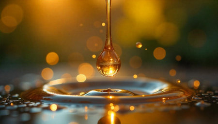 A single water droplet forms and creates ripples in a shimmering golden liquid during early dawn.