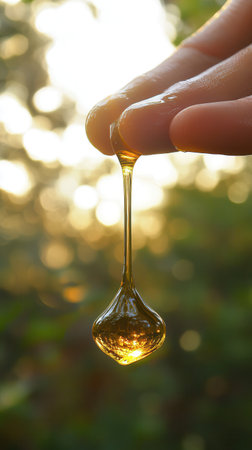 A person is holding a drop of homeopathic oil, allowing it to stretch and hang in the air while surrounded by a natural setting during sunset. The scene captures the essence of holistic health.