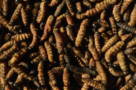 Close up of Black soldier fly (BSF) larvae or maggot, Hermetia Illucens insect farms for fish and poultry feed.