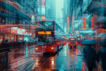 City bus in motion during nighttime with vibrant neon lights and bustling streets