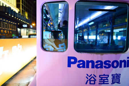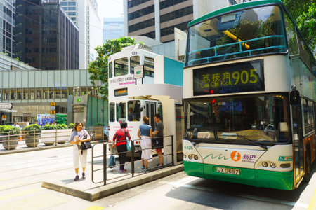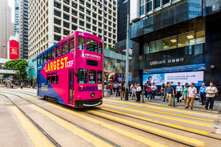 HONG KONG - OCTOBER 02: Unidentified people using tram in Hong Kong on October 02, 2017. Hong Kong tram is the only in the world run with double deckers and one of the main tourist attractions.