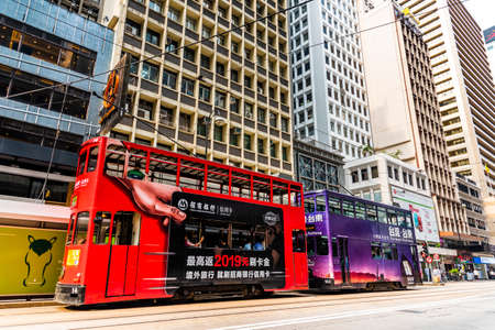 HONG KONG, CHINA - CIRCA JANUARY, 2019: typical HKT double-decker trams in Hong Kong in the daytime.