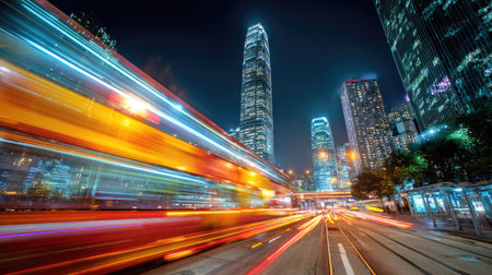 A night view presents a cityscape with tall skyscrapers illuminated against a dark sky. The scene features blurred streaks of light from moving vehicles. The composition highlights the structures' architecture, colors, and the dynamism of the urban environment, suitable for various commercial applications.