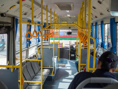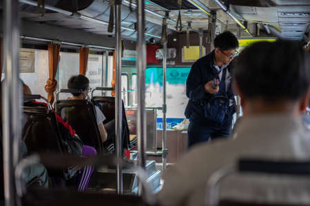 Bangkok, Thailand - 29 Dec, 2019: Local Thai passenger sit at the seat of air conditioner Bangkok bus for travel around Bangkok area, Thailand.