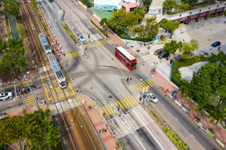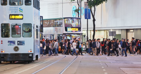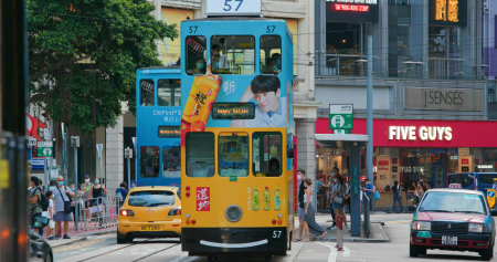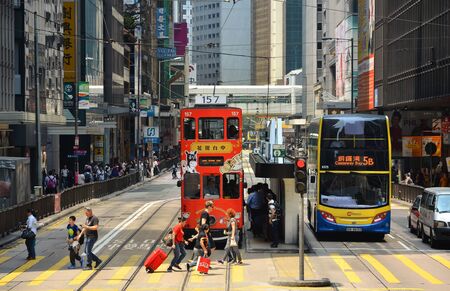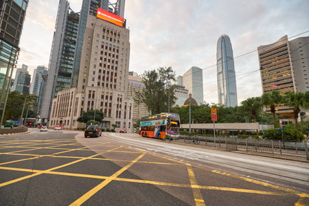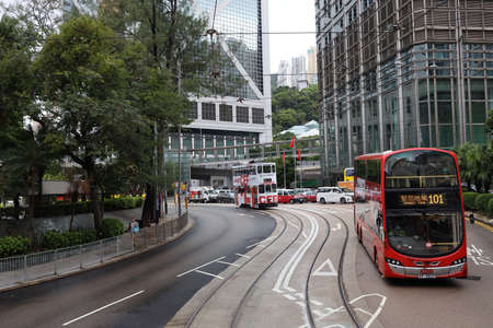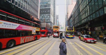 City road with cityscape of Hong Kong, double-decker trams on the street, urban life.