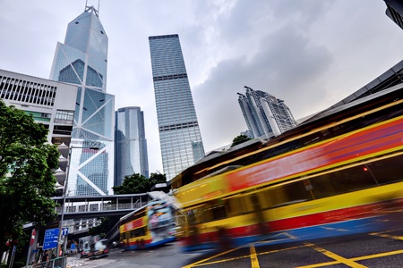 Famous double-decker trams with the background of the Modern building in Hong Kong Island.