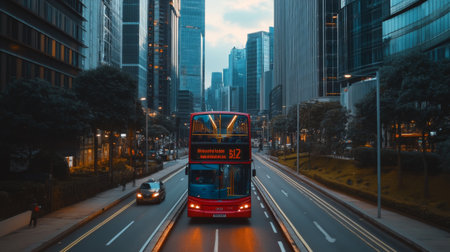 A wide-angle shot of a double-decker bus traveling through a scenic city route, highlighting the iconic design and panoramic cityscape.