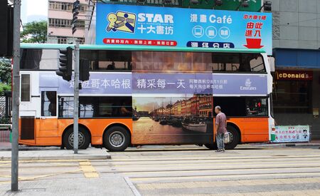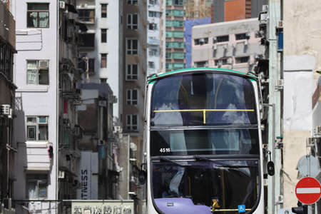 HONG KONG - September 5, 2017: Double decker bus driving on city road. Public Transport in Hong Kong.