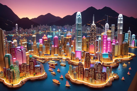 Nighttime Skyline of Vibrantly Lit Hong Kong Harbor With Towering Skyscrapers and Majestic Mountains
