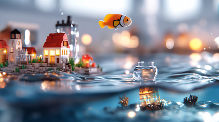 A whimsical underwater scene featuring a vibrant clownfish, miniature houses, and tiny boats floating on the water's surface, creating a magical atmosphere.