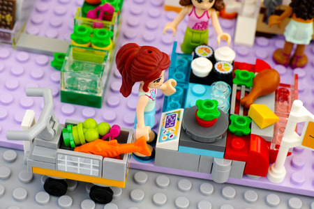 Tambov, Russian Federation - February 09, 2016 Lego girl with trolley in supermarket weighing vegetables . Studio shot.
