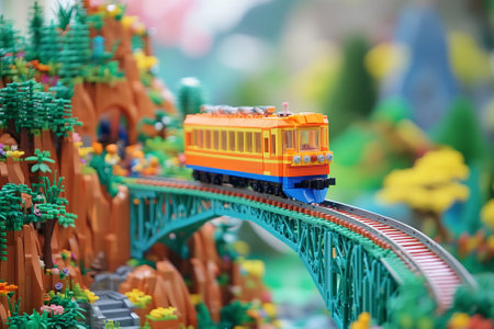 train rides on lego minecraft style toy bridge