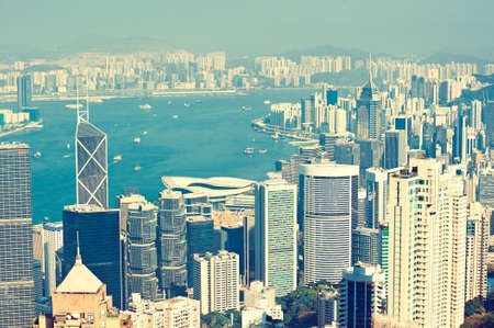Panoramic cityscape view from Victoria Harbour in Hong Kong