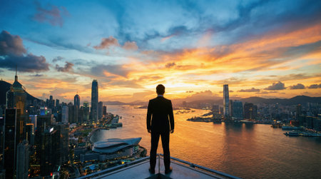 A silhouette of a man in a business suit stands on the edge of a skyscraper, looking out at a vibrant city and harbor during a beautiful, colorful sunrise or sunset.