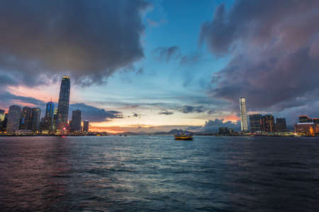 Panorama of Victoria harbor of Hong Kong city at dusk
