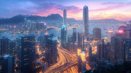 A nighttime view of Hong Kong featuring a vibrant skyline with illuminated skyscrapers, bustling streets with light trails, a peaceful harbor with boats, and distant mountains under a colorful twilight sky.