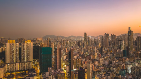 Aerial view of Hong Kong city skyline at sunset, China.