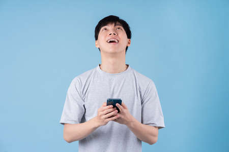 Studio shot of Cheerful portrait close up japaness woman while standing with a blue background.