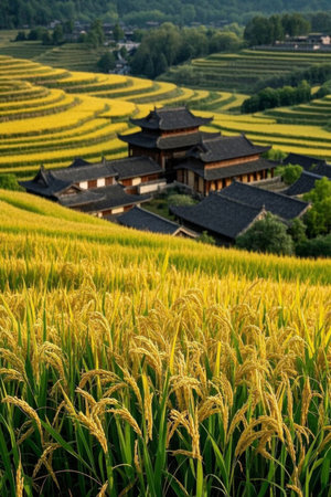 Traditional houses nestled in the lush, mist-covered rice terraces of a mountainous region, creating a serene and picturesque landscape.