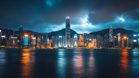 Hong Kong city skyline at night over Victoria Harbor with cloudy sky and urban skyscrapers