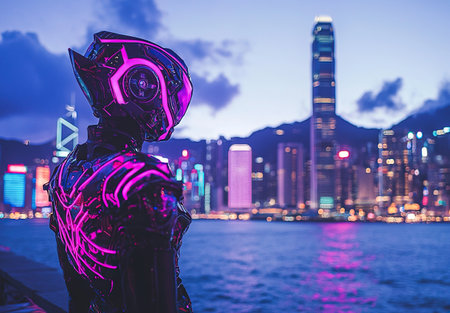 Futuristic figure in neon attire against a vibrant city skyline at dusk