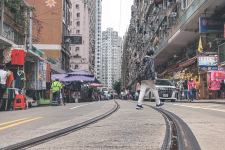 Hong Kong, March 24,2019: Strolling among the skyscrapers through the streets of Hong Kong during a cloudy day