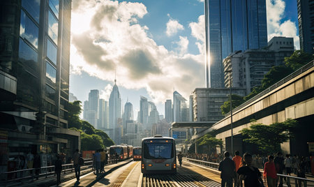Discover a breathtaking perspective of a vibrant urban skyline bathed in golden light. This stunning composition captures the essence of city life at twilight, showcasing a beautiful interplay of lights and architecture.