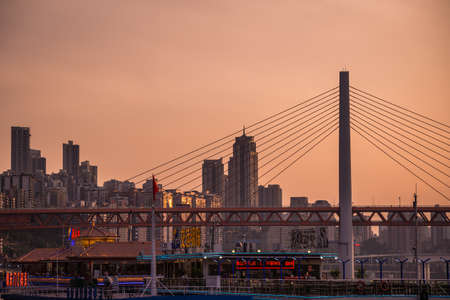 Chongqing, China - August 2019 : Illuminated DongShuiMen road bridge over and across mighty Yangtze river in Chongqing town at dusk