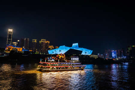 Chongqing, China - August 2019 : Luxury passenger tourist ship cruising on the Yangtze and Jialing Rivers at night with illuminated skyscrapers in the background