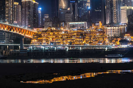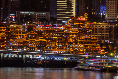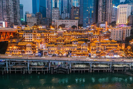 Chongqing, China - August 2019 : Nightscape of brightly lit stunning Hongyadong Ancient Town