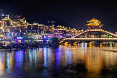 Fenghuang, China - September 22, 2017: Amazing night view of Phoenix Ancient Town and the Tuojiang River (Tuo Jiang River). Tourists walking along embankment and scenic bridge.