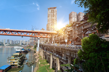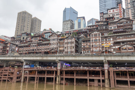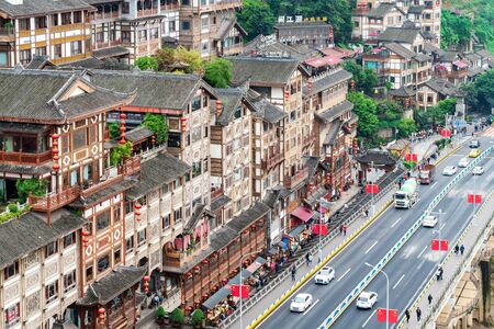 Street scene of Chinese-style buildings in Hongyadong by the river in Chongqing