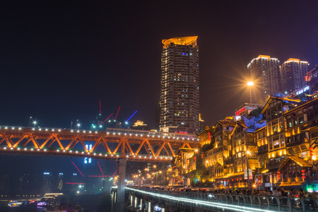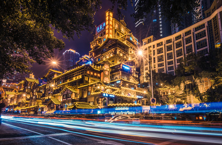 CHONGQING, CHINA – MARCH 13: Hongyadong shopping complex at night on March 13, 2018 in Chongqing. With 17M population, it is the most populous Chinese municipality.