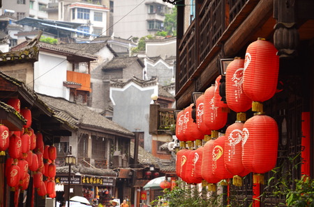 Fenghuang, China - May 15, 2017: The decoration of red umbrella on the streets of Fenghuang Ancient Town (Phoenix ancient town).