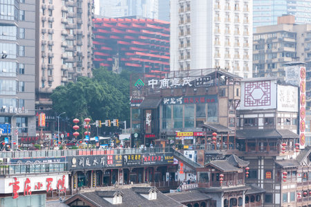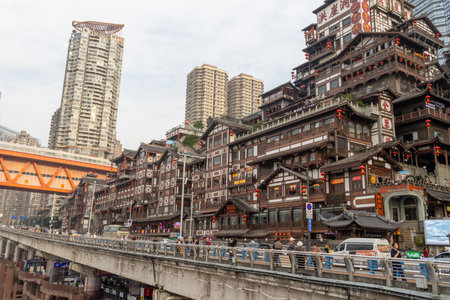 CHONGQING,CHINA-OCTOBER 15,2019: Hongyadong complex in the shape of a large ancient building. Inside, there are shops, restaurants, hotels, souvenir shops, etc. And good view point