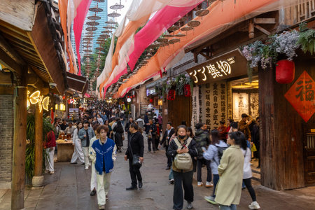 Chongqing, China- 11 Nov 2025: Tourists visit to Ciqikou in Chongqing, China. Ciqikou is a well-preserved ancient town famous for its Ming and Qing Dynasty architectural style